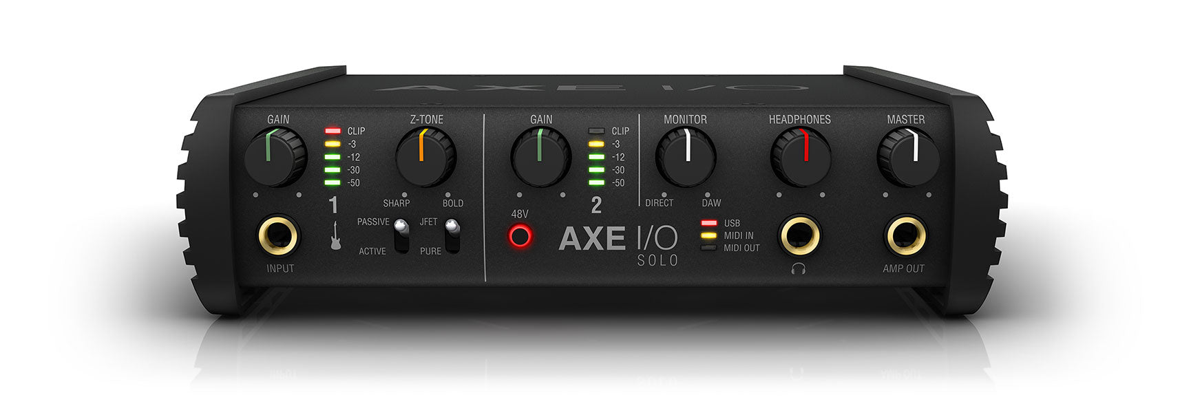 AXE I/O, IK’s award-winning audio interface, set a new standard for guitar-oriented recording interfaces. Now AXE I/O Solo brings the same great tone shaping, convenient features and premium sound to everyone, everywhere, in a compact and affordable 2-in / 3-out format.